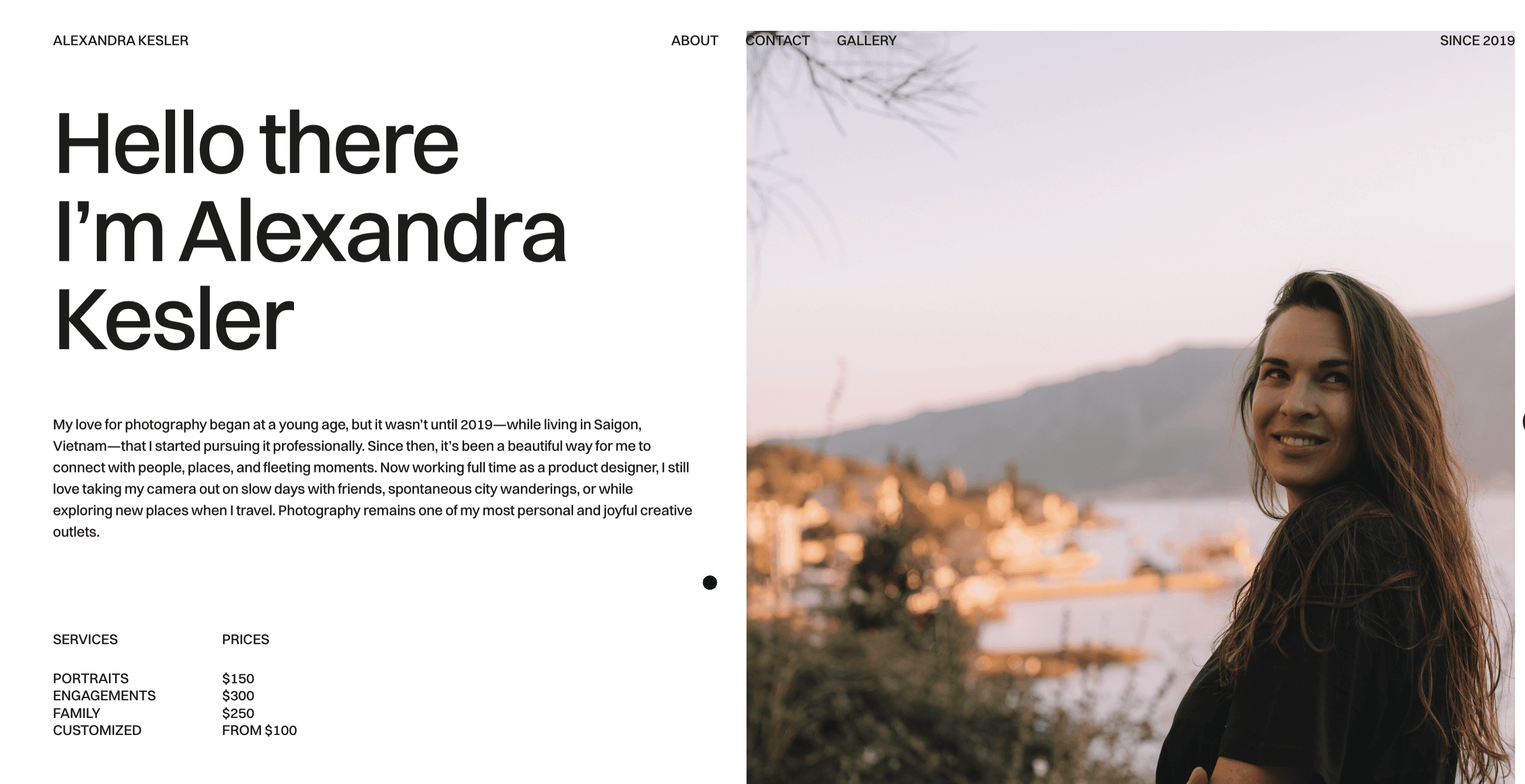 The design needed to feel like an extension of Alexandra’s visual world—calm, curated, and quietly powerful. I leaned into a minimal layout with generous white space, soft transitions, and a muted palette that allowed her photos to shine. Every design element, from the typography to the image spacing, was carefully considered to support a fluid, gallery-like experience that felt intuitive and immersive rather than flashy.