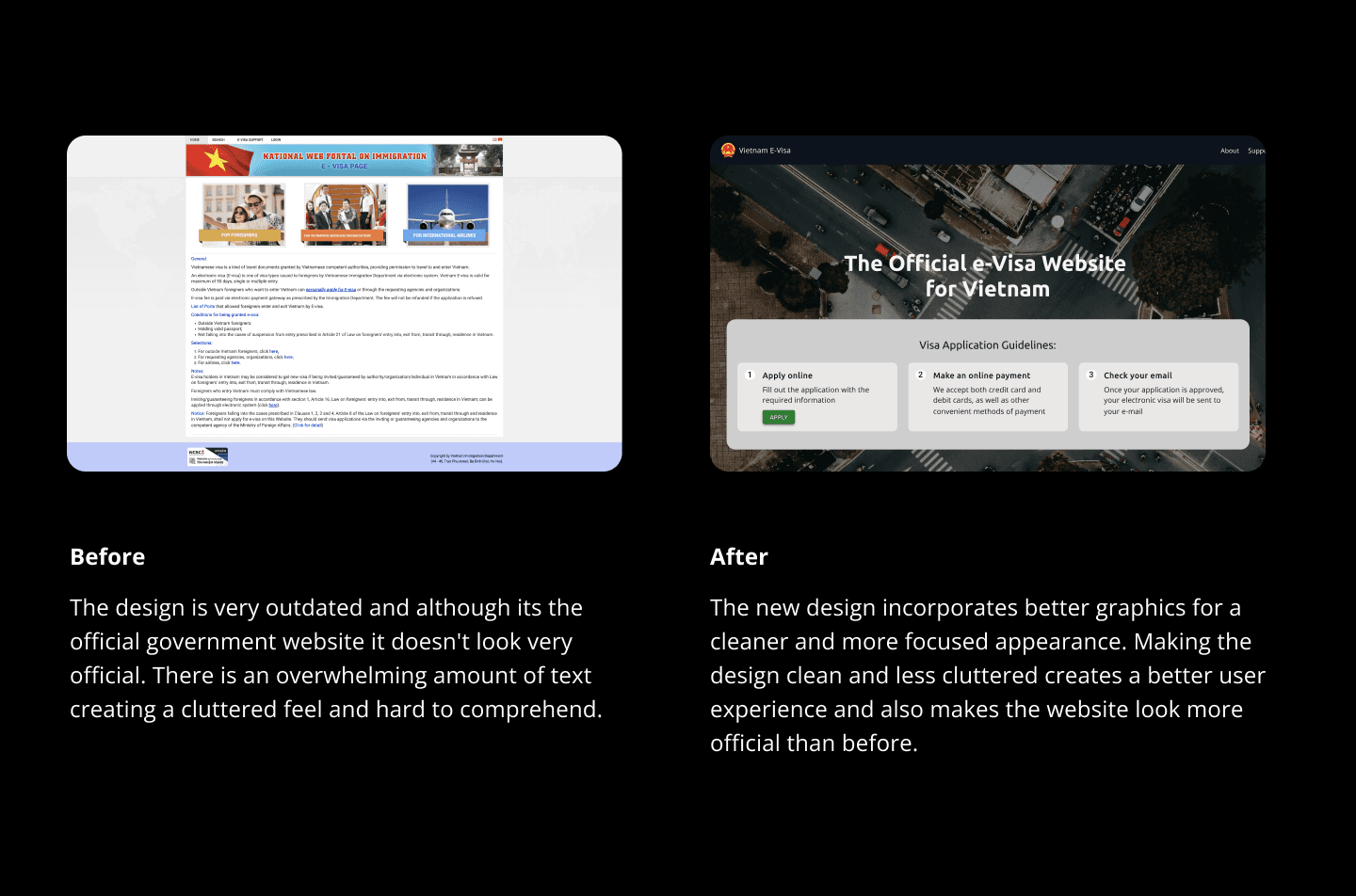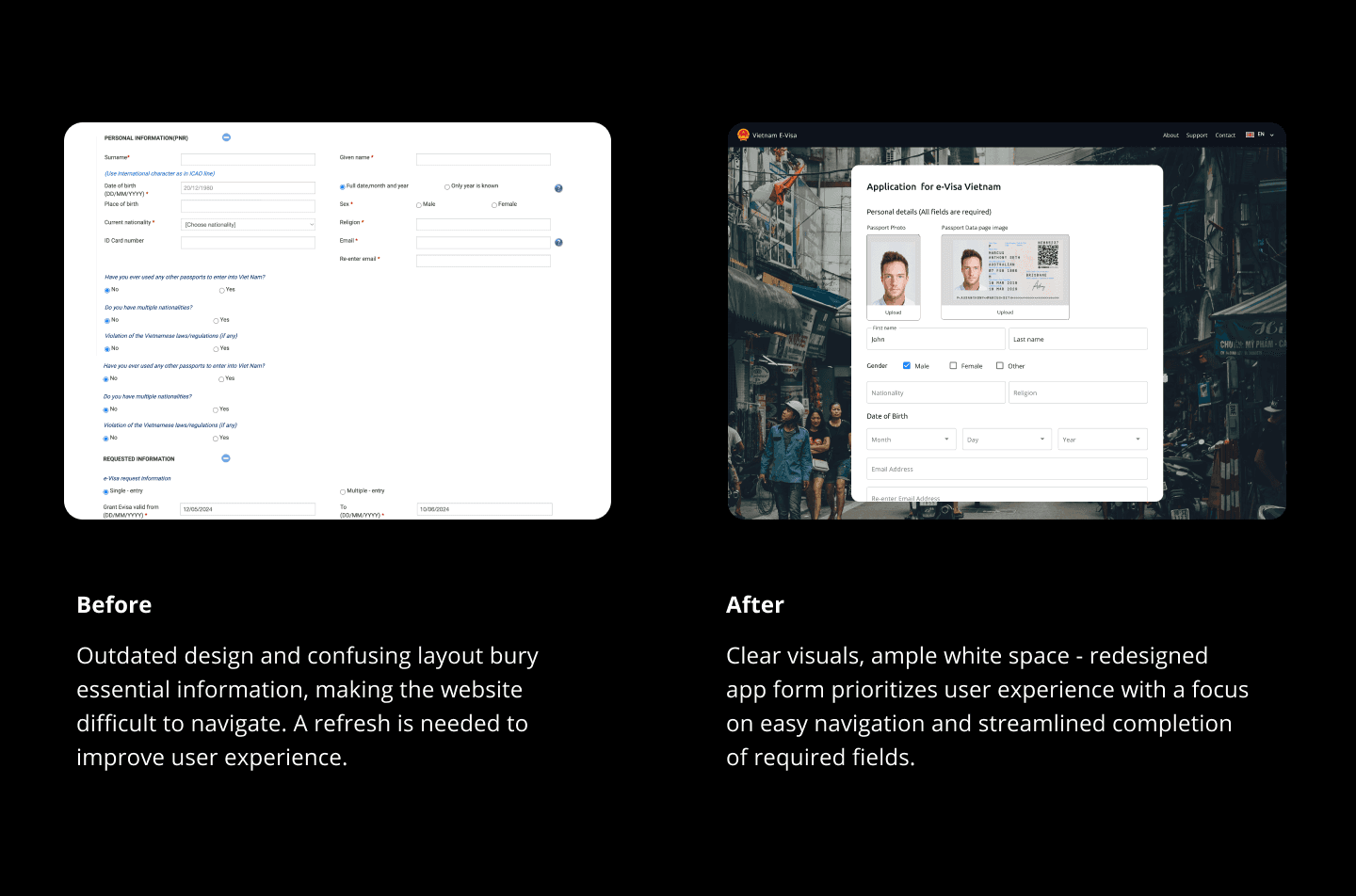 I prioritized user needs for the redesign of Vietnam's e-visa website. Identified pain points included overly complex forms for tech-savvy travelers and unclear instructions for novice travelers. By combining these user insights with Vietnam's government regulations, I crafted a user-friendly and compliant website. This involved designing a clear and intuitive interface, simplifying forms, and providing helpful guidance throughout the application process, ensuring a smooth and efficient e-visa application experience for all travelers. This resulted in a significant improvement in the user experience and a more efficient e-visa application process.