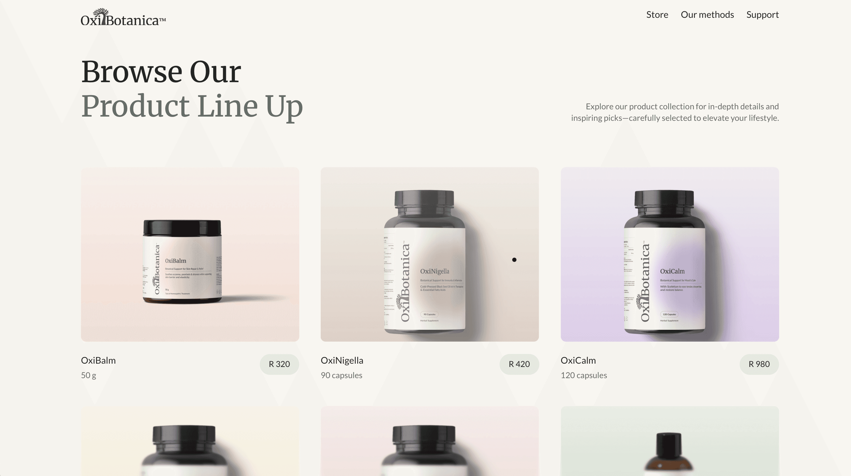 OxiBotanica is a botanical wellness brand combining clinical research and natural ingredients to deliver high-integrity, plant-based formulas. The design goal was to create a cohesive brand identity and digital presence that aligns with the live oxibotanica.co.za experience - conveying credibility, emotional resonance, and a premium, calming shopping journey. My role included full branding (logo, visual system, packaging) and end-to-end UX/UI for the e-commerce platform.